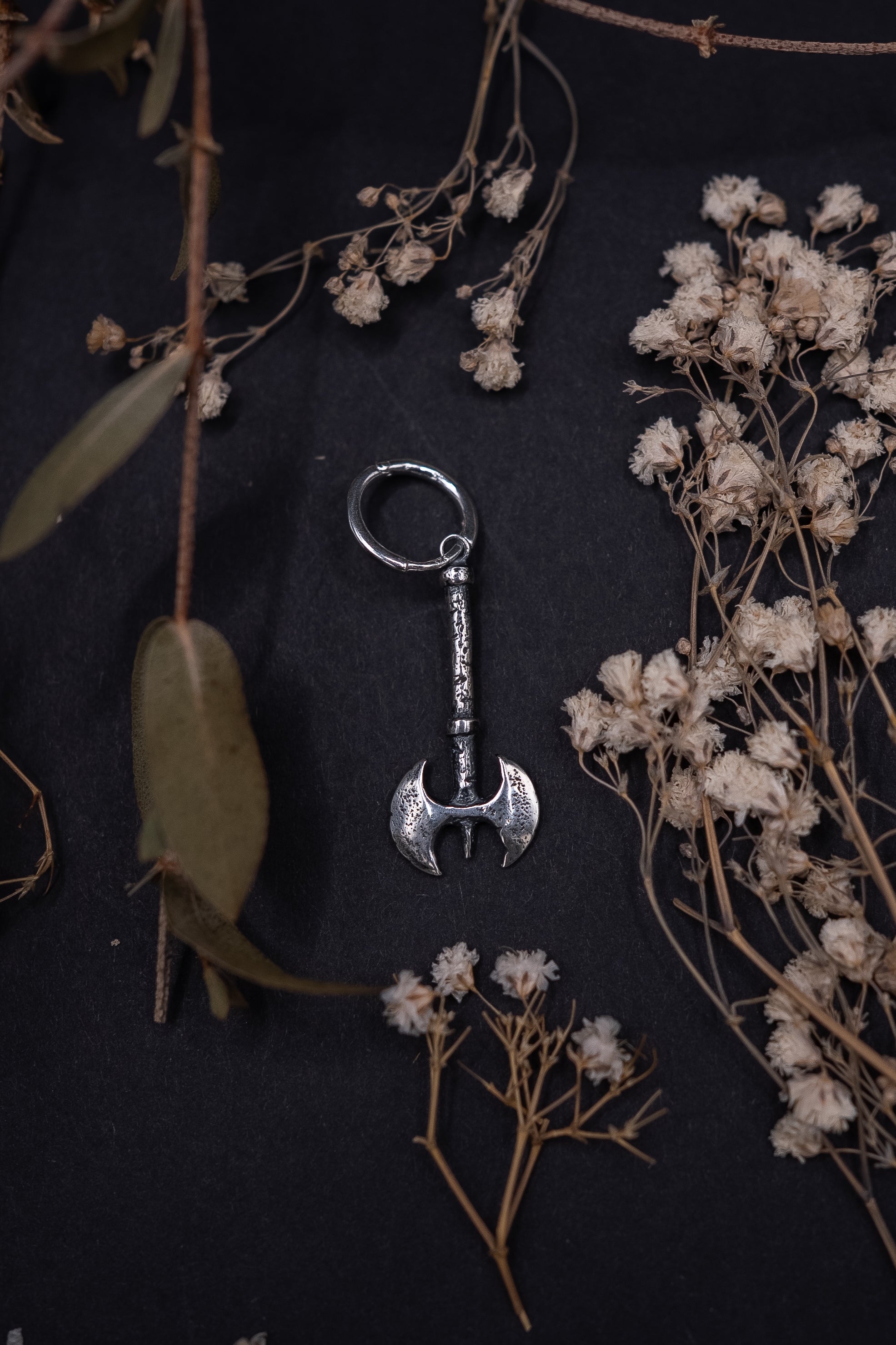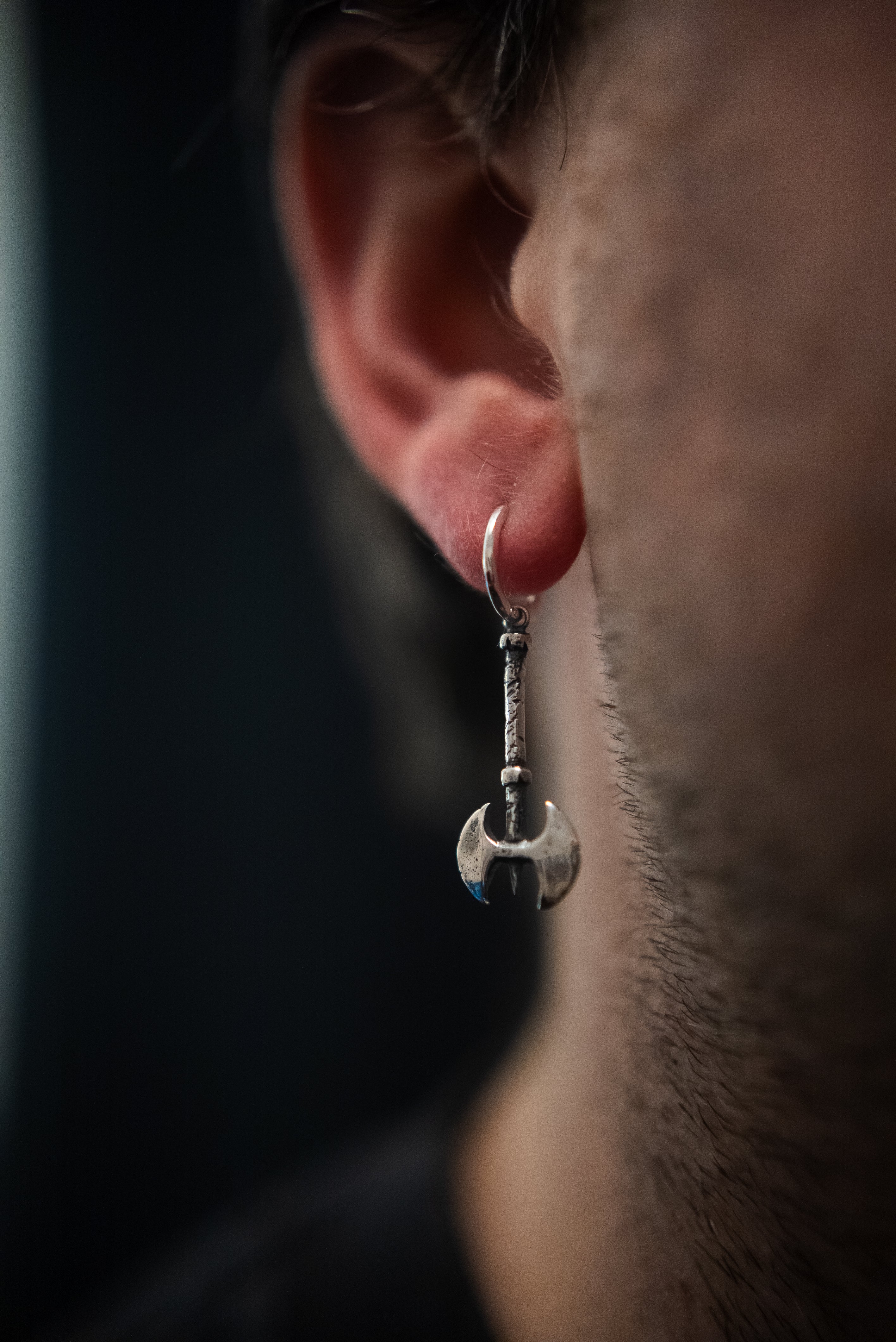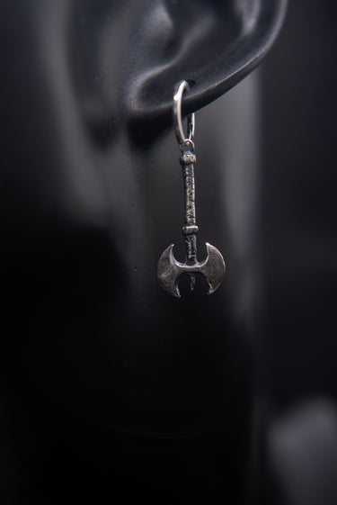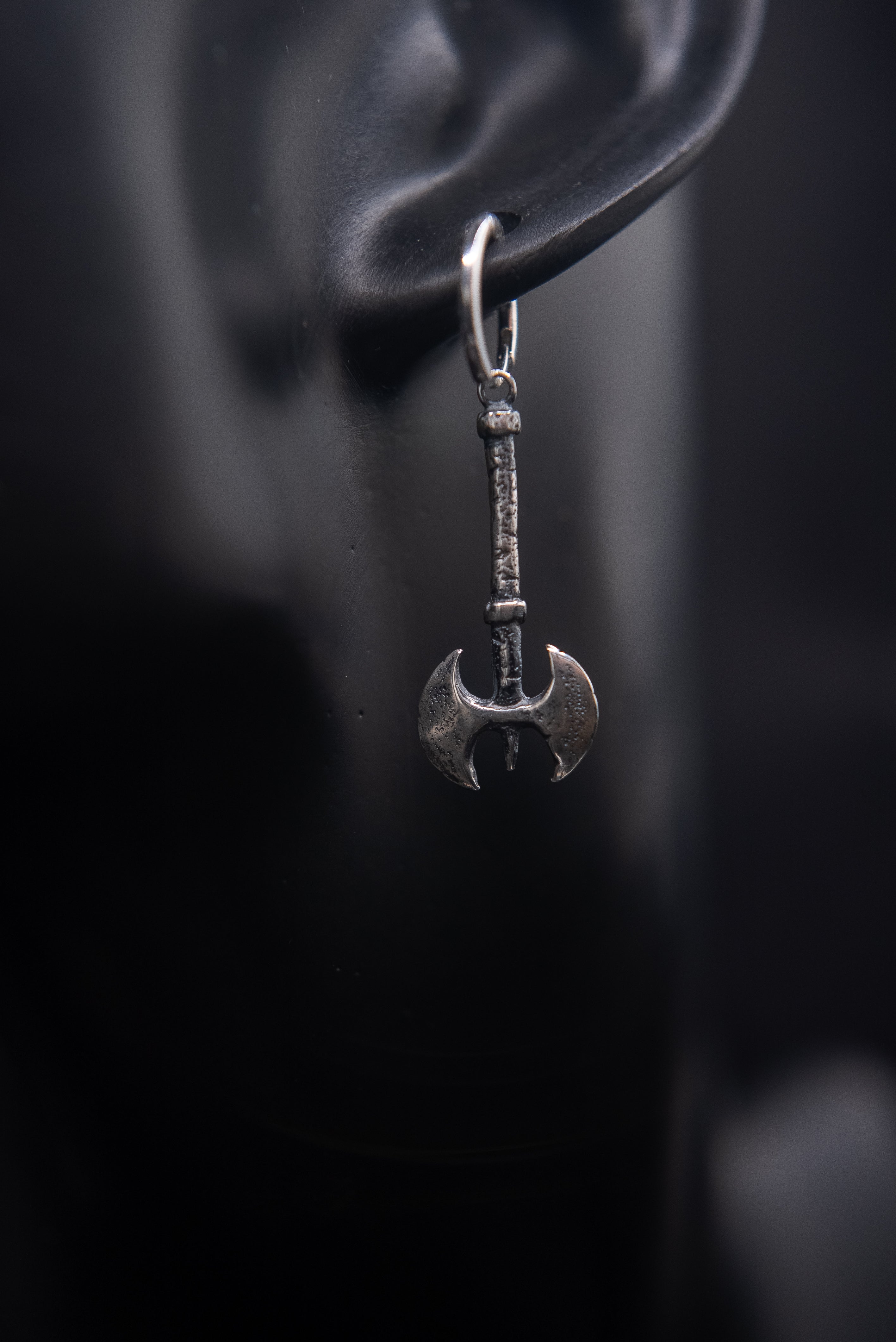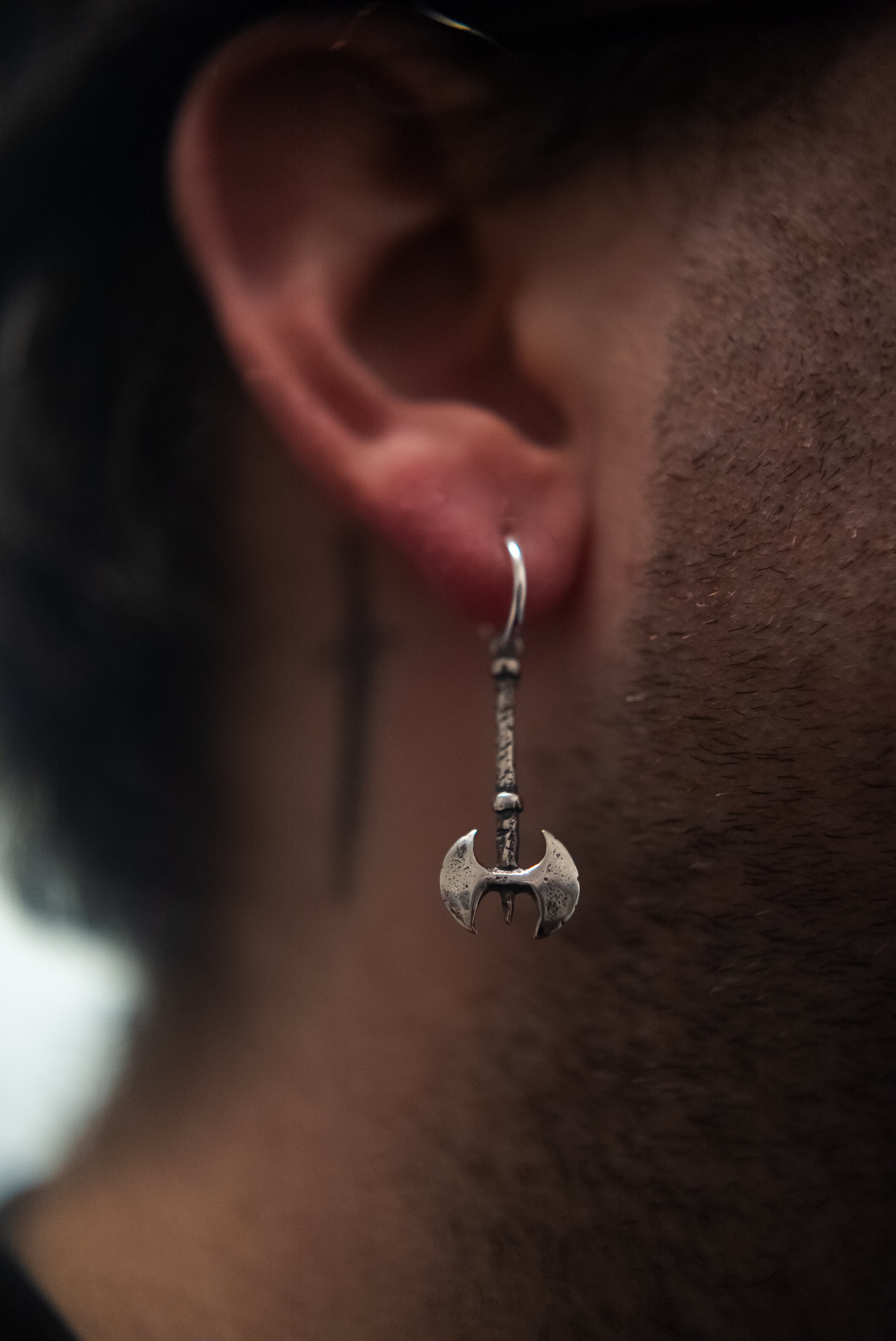 Dungeons and Dragons & 'Barbarian class' inspired battle axe earring. The design features a 'battle worn' aesthetic and has been oxidised to exaggerate details within the design.