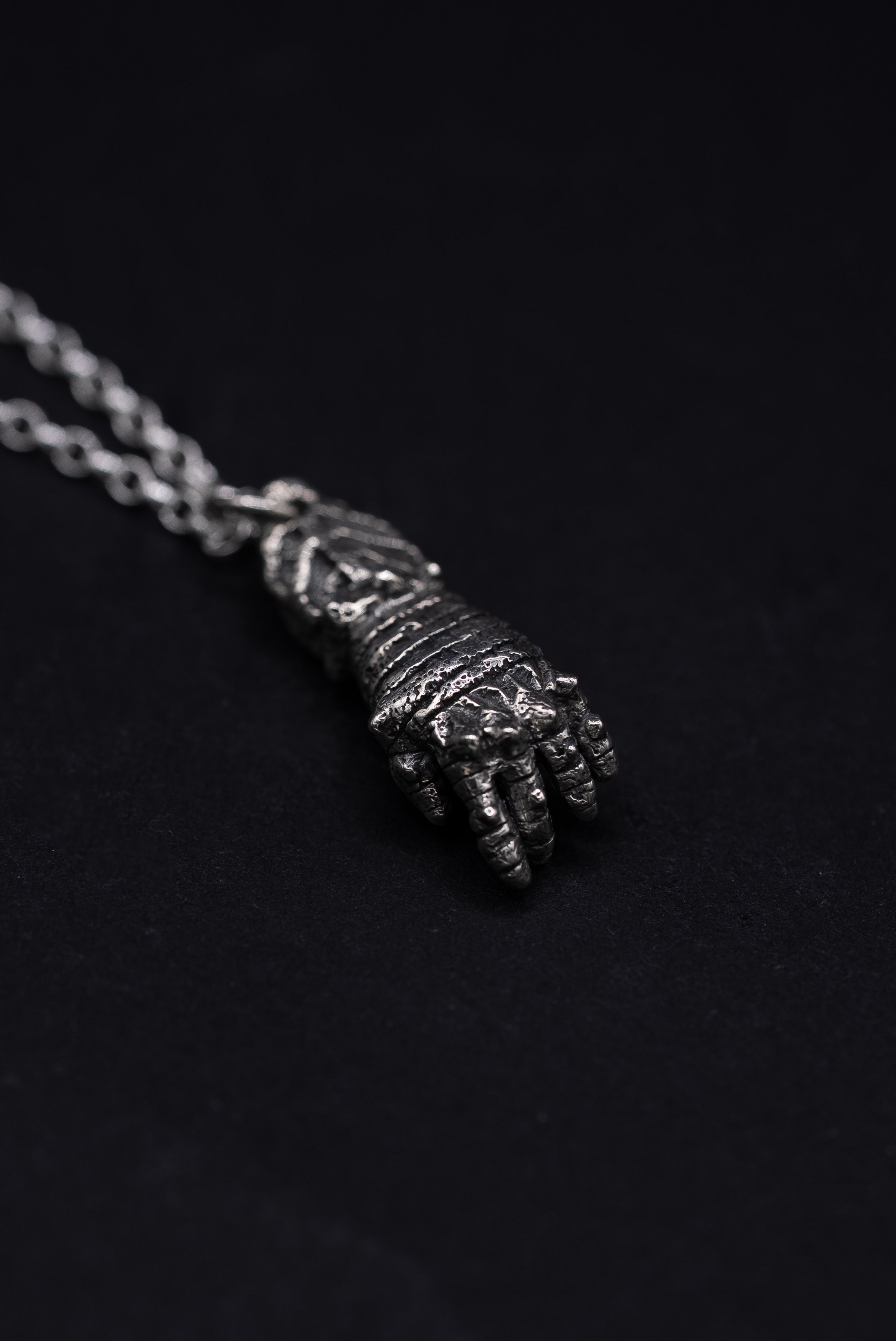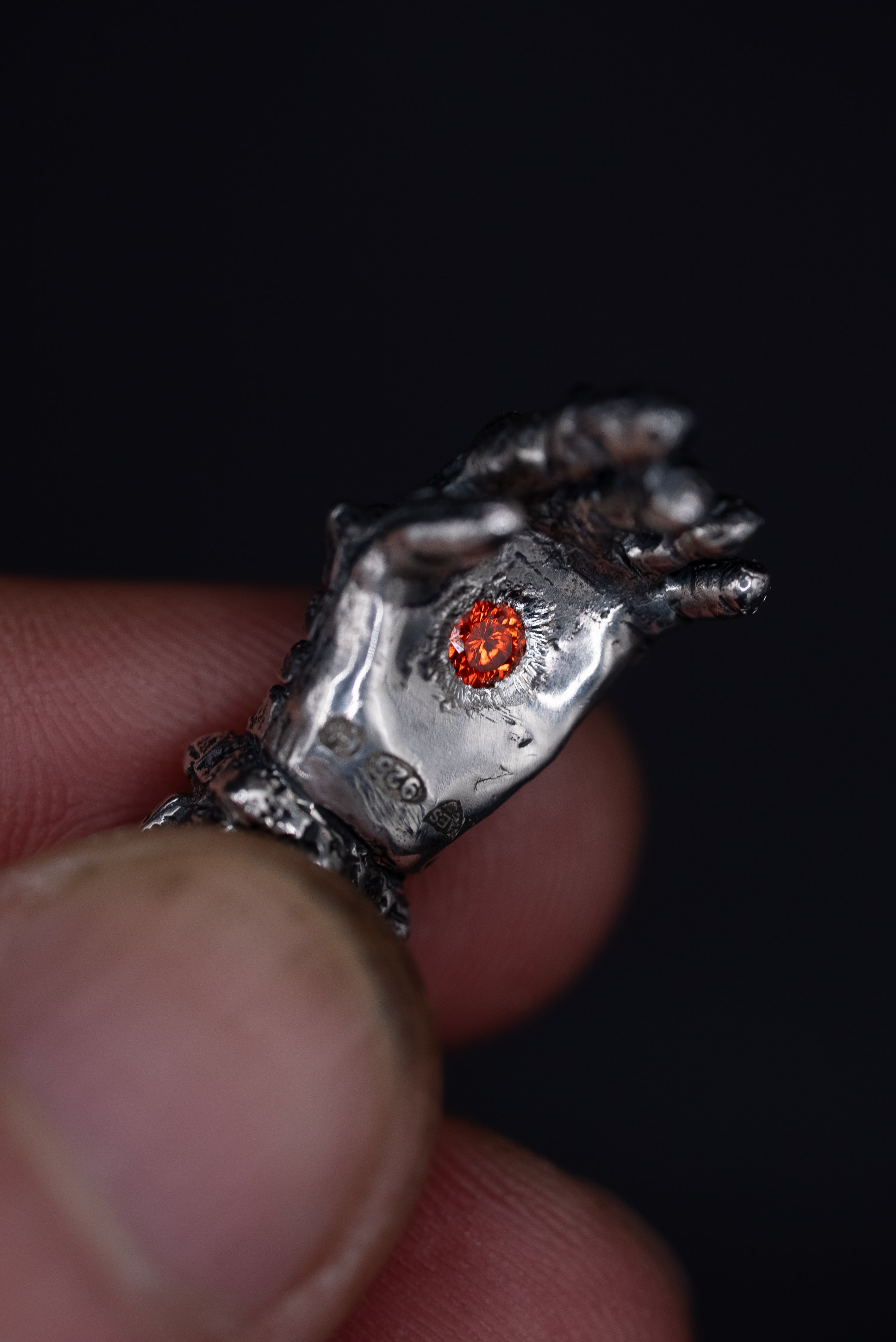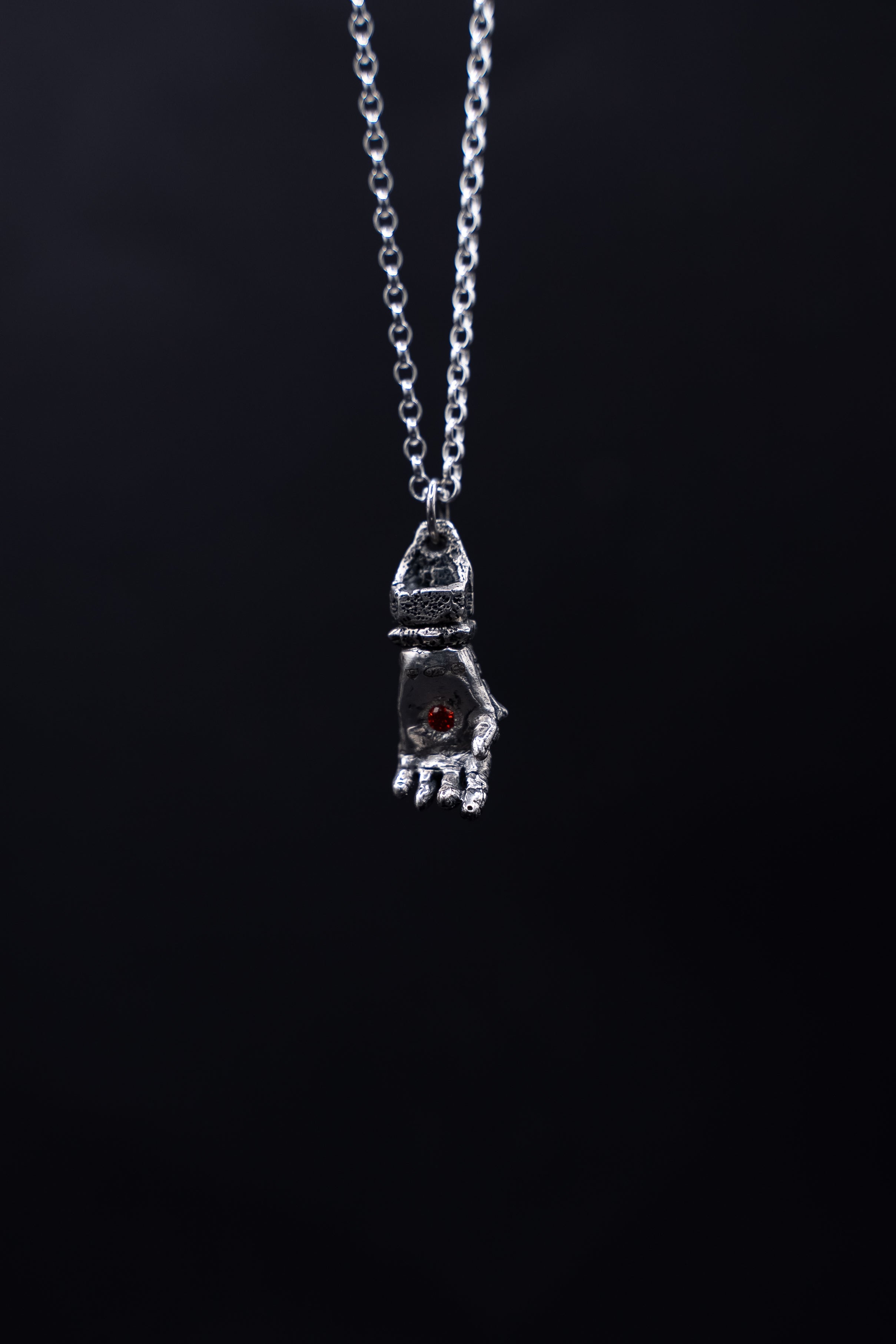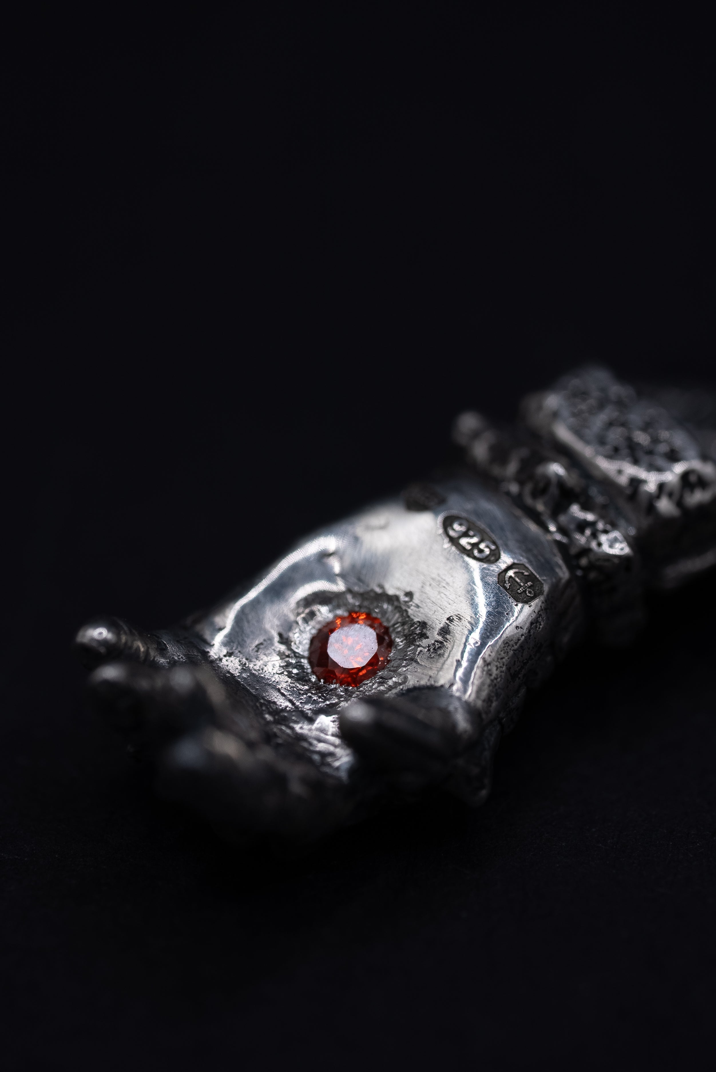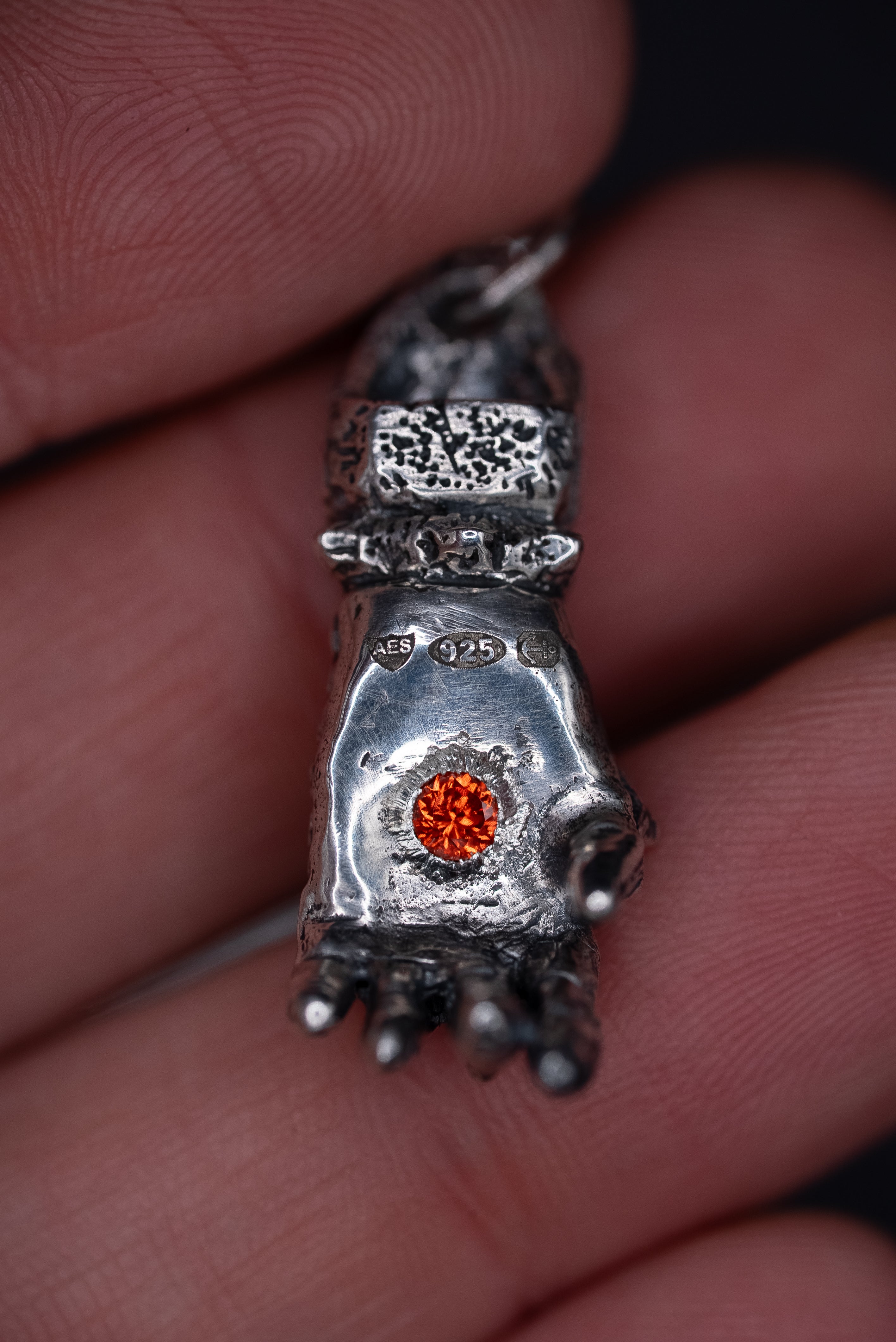 Inspired by fantasy/medieval gauntlets. The pendant features a 3mm cz (red) in the palm of the hand. The silver has been oxidised and textured to create a gritty/worn aesthetic to the gauntlet.