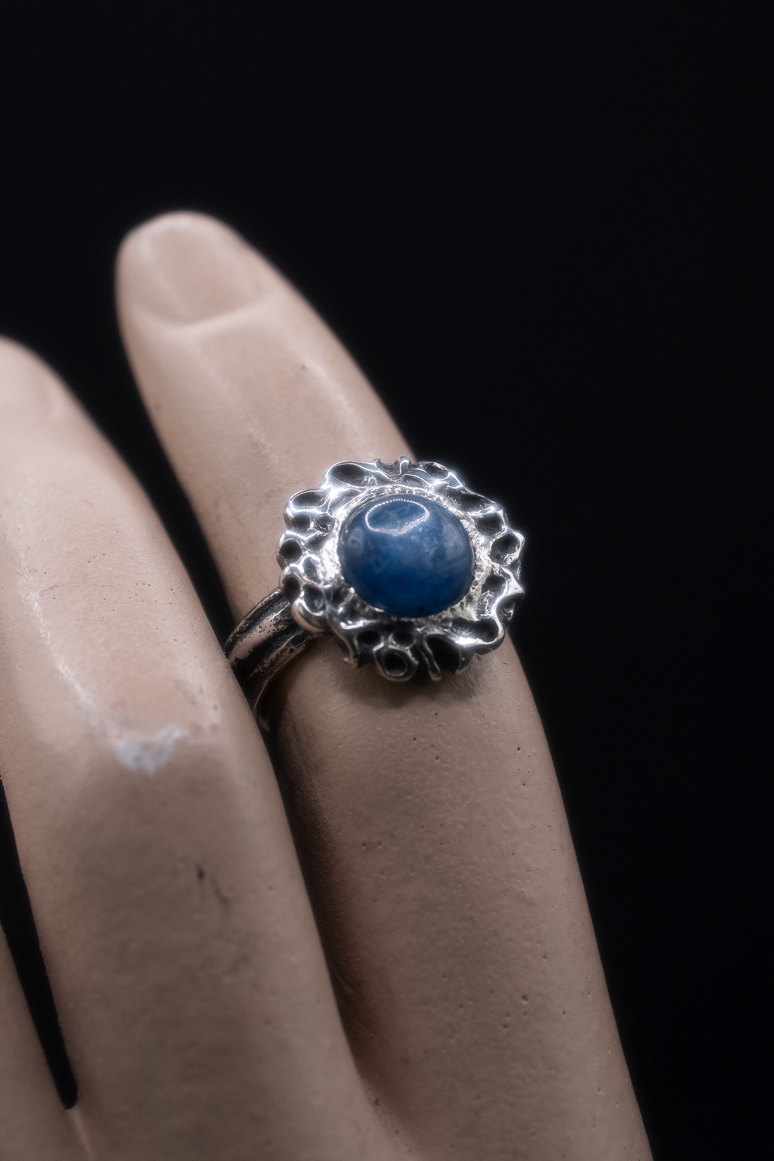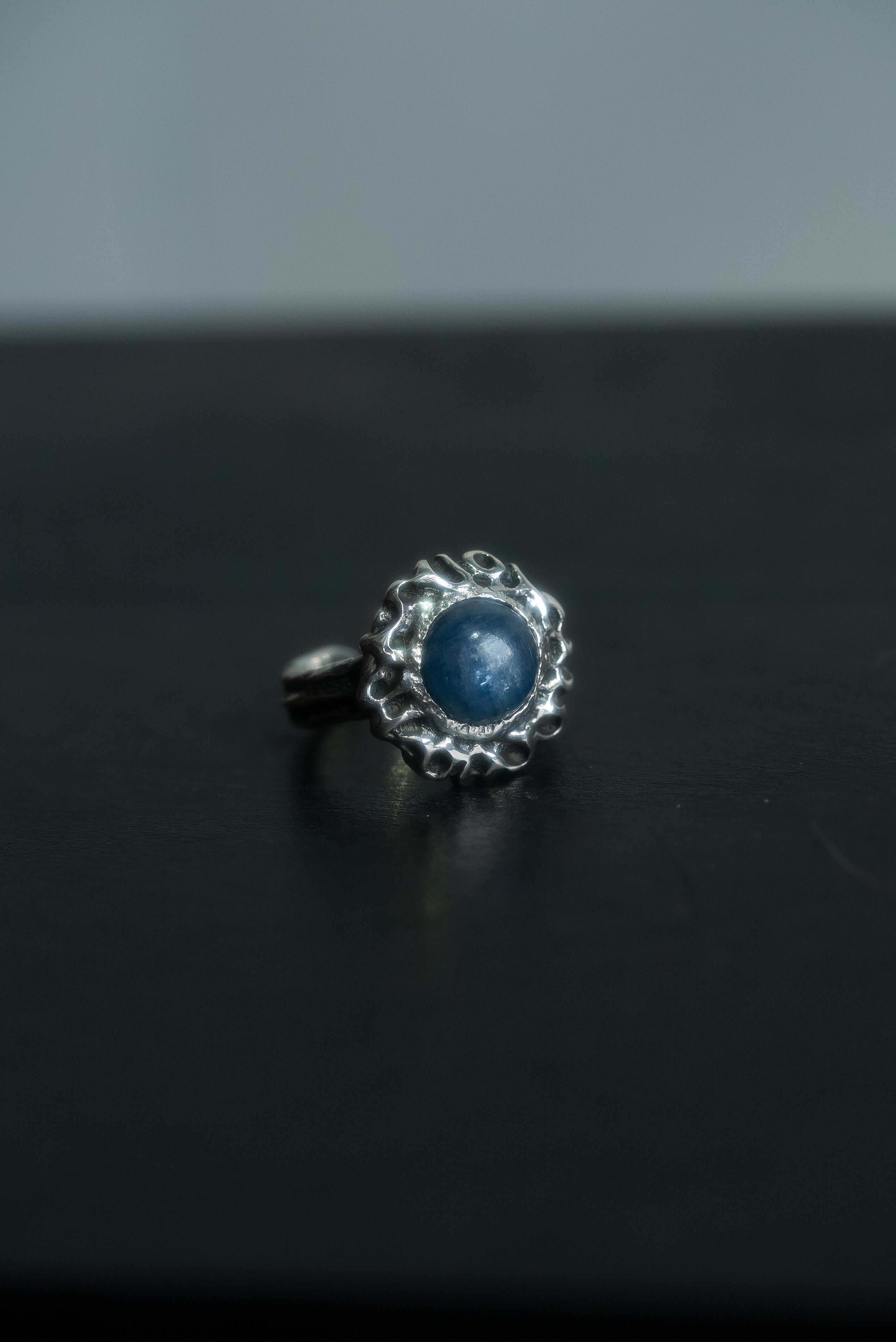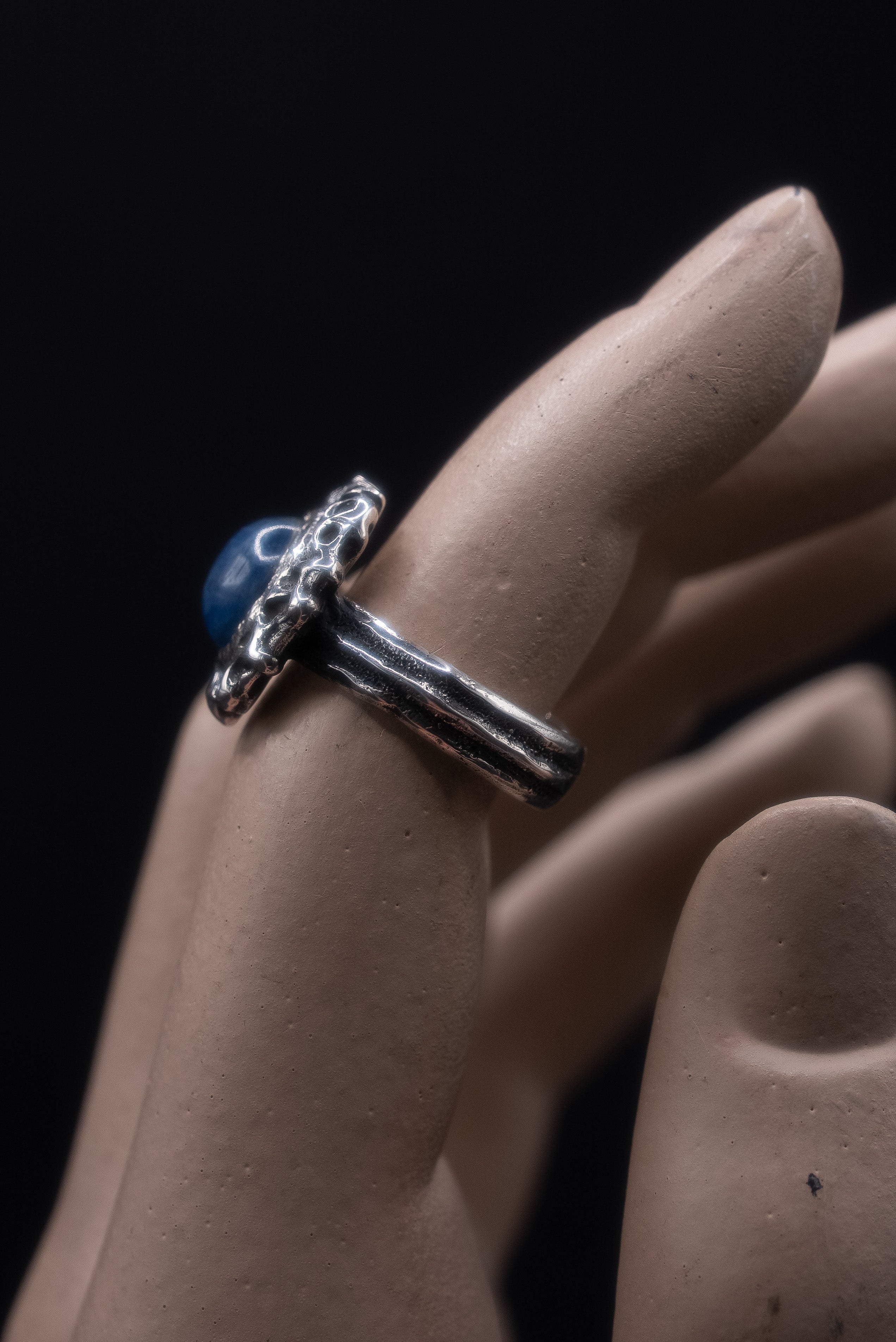 Inspired by Ranni's Dark Moon Ring (featured in Elden Ring). The ring has been oxidised and polished to exaggerate the features of the design. The ring was first hand-carved in wax and then cast in sterling-silver. The ring features a 12mm kyanite cabochon and a 'half' band ring shank.