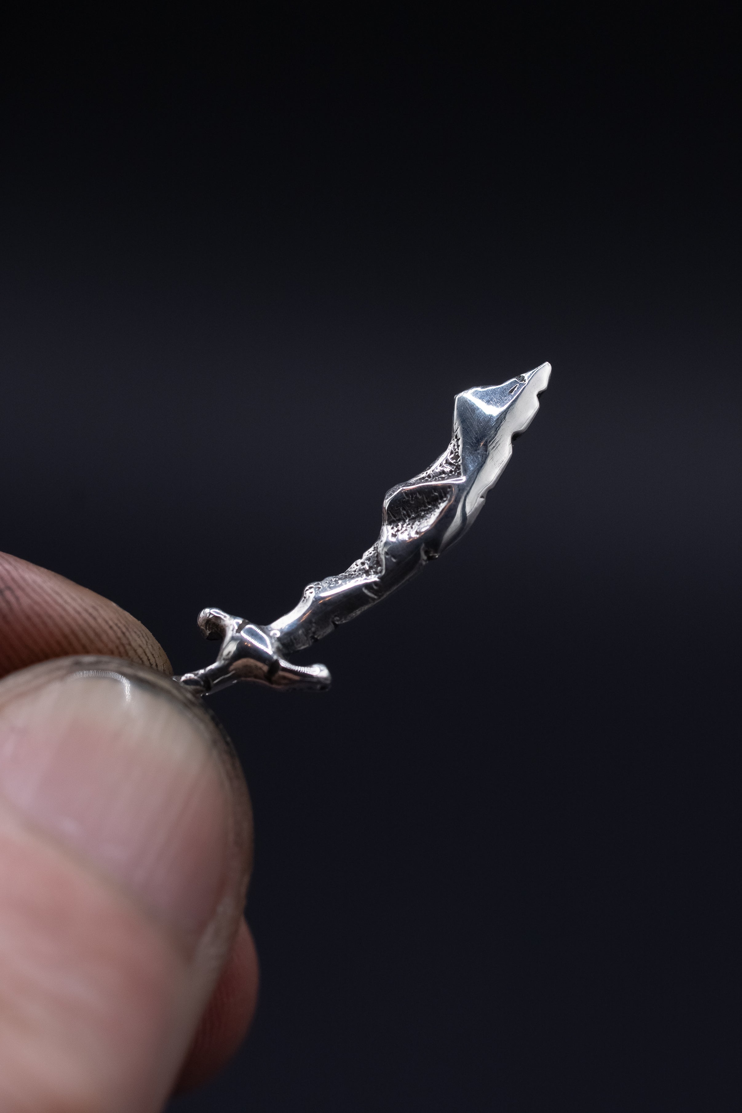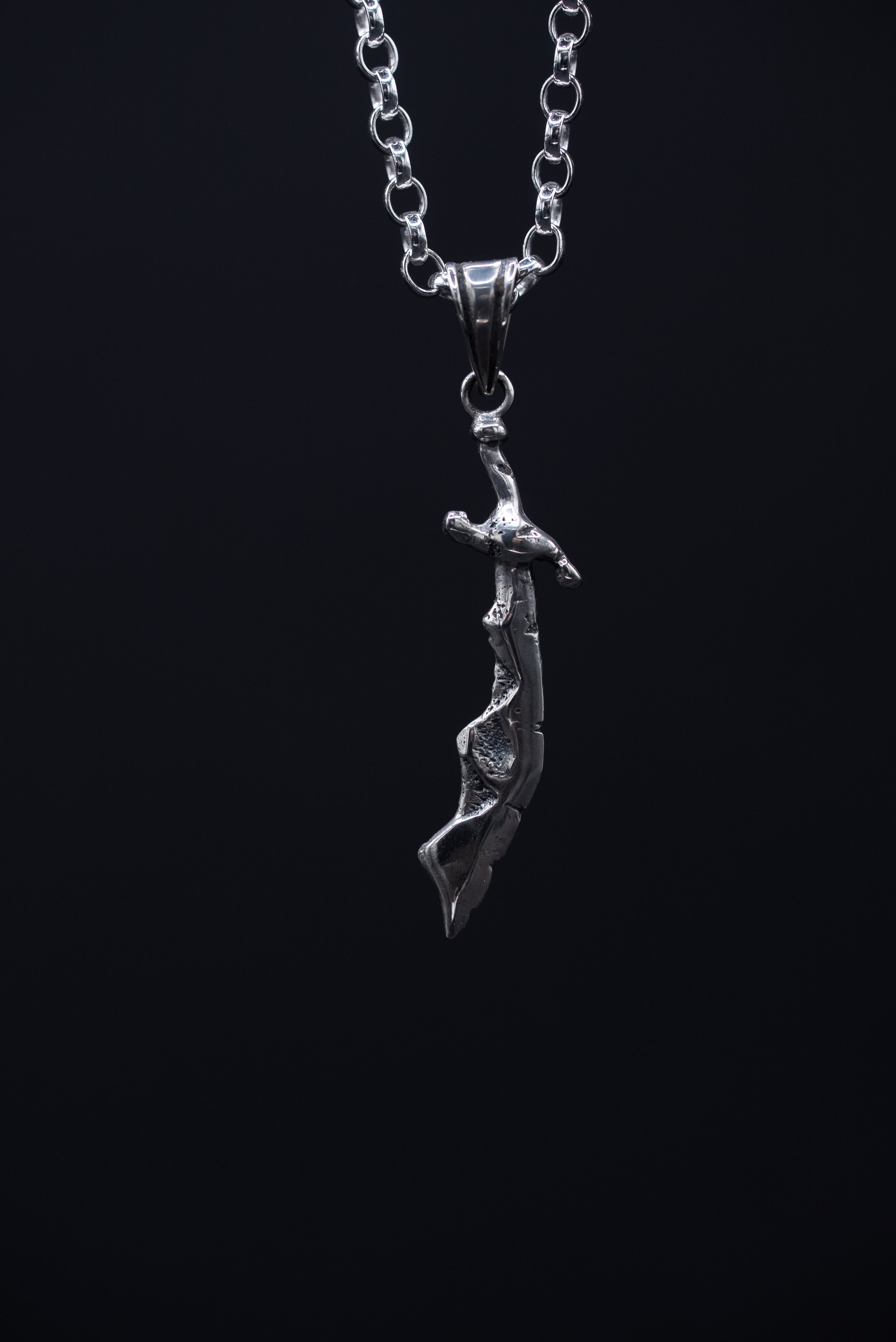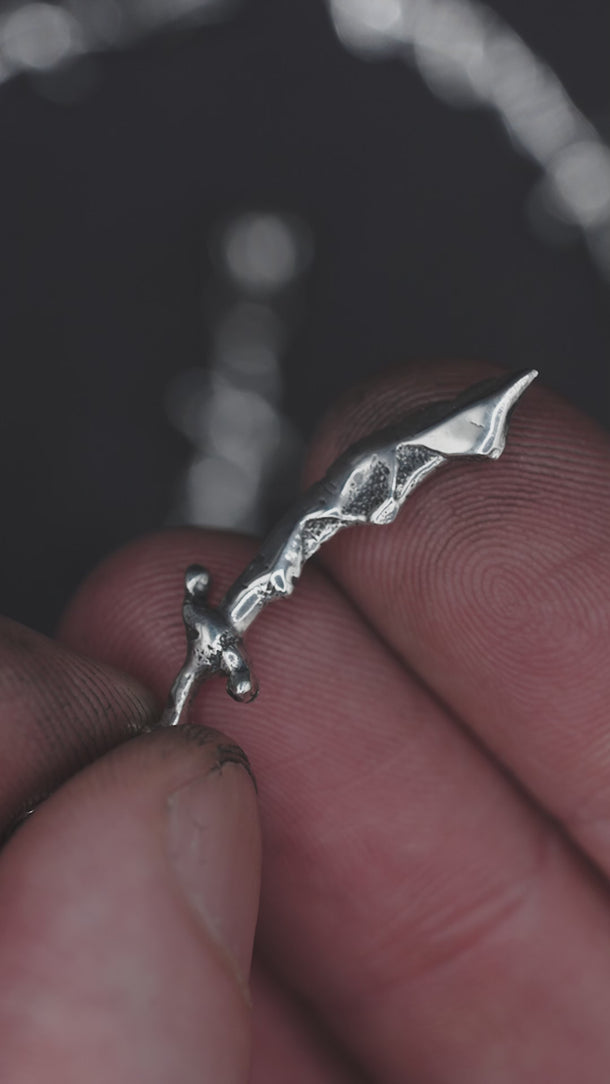 Inspired by the Dragon 'Scimmy' / Scimitar weapon from Old School Runescape. The design features marks and chips to give a 'worn' look to the weapon. The pendant has been hand-carved in wax before being cast in sterling-silver and oxidised to exaggerate the hand-engraved textures.