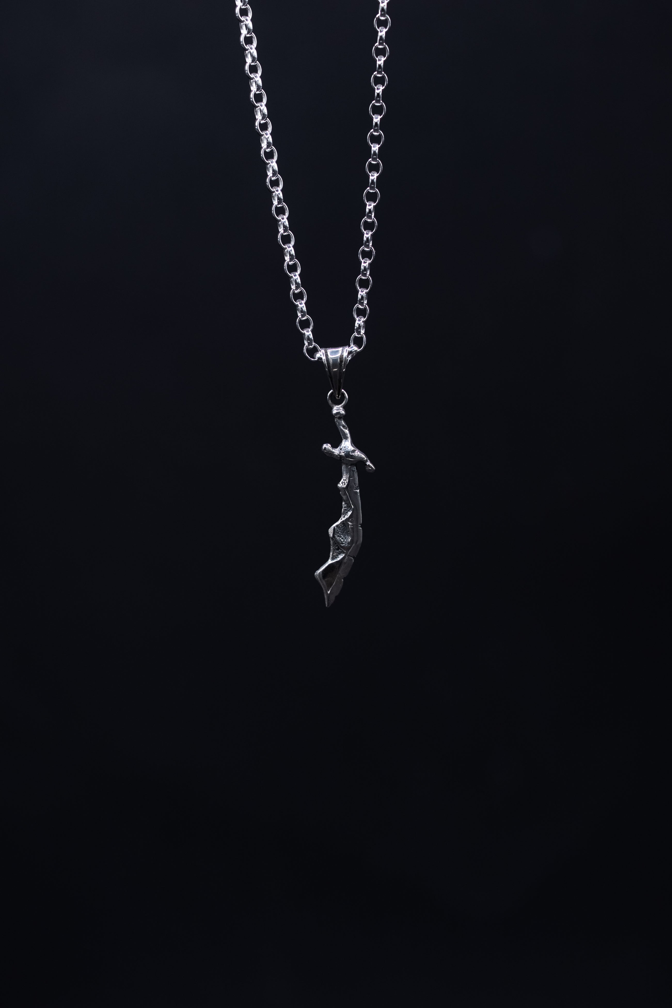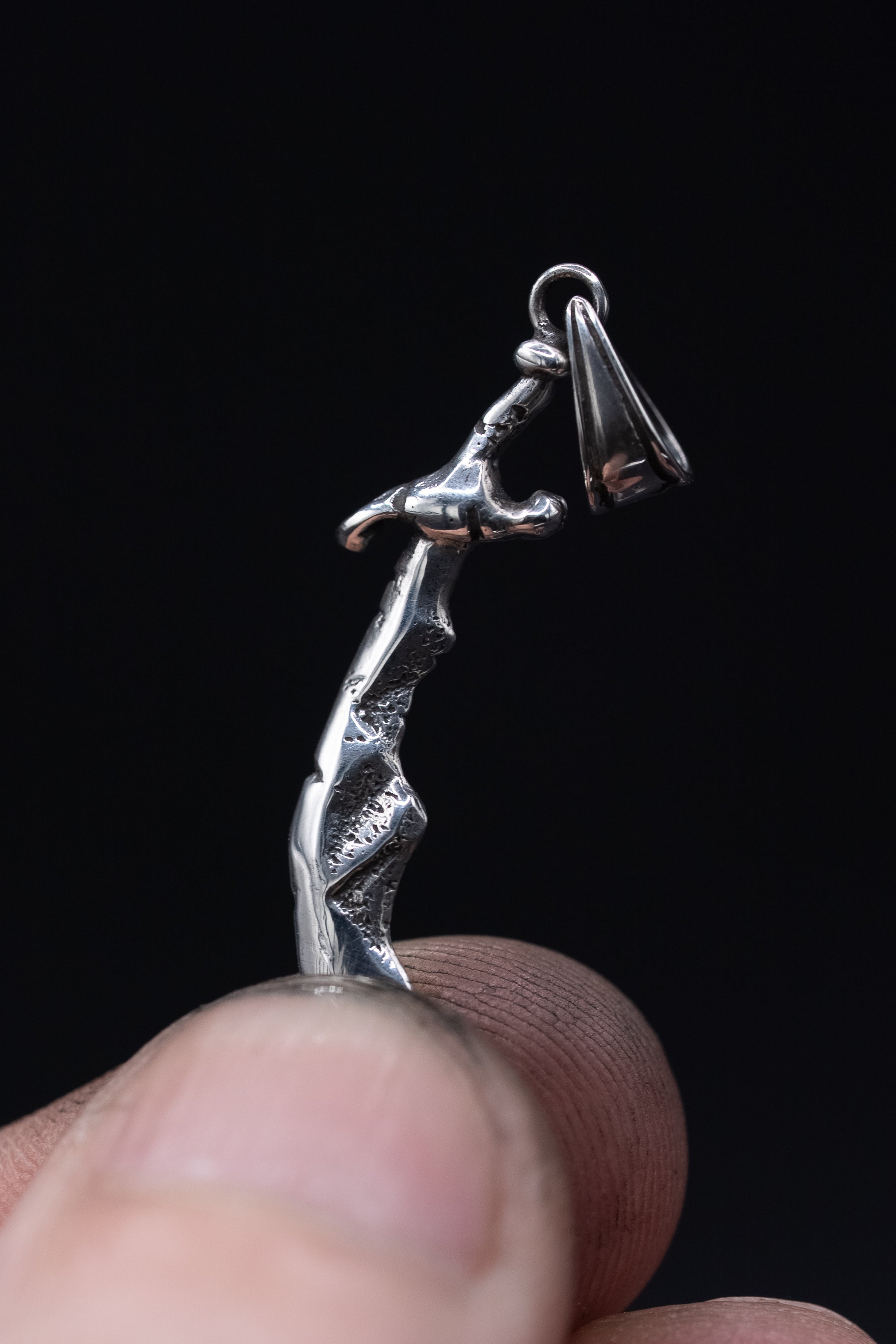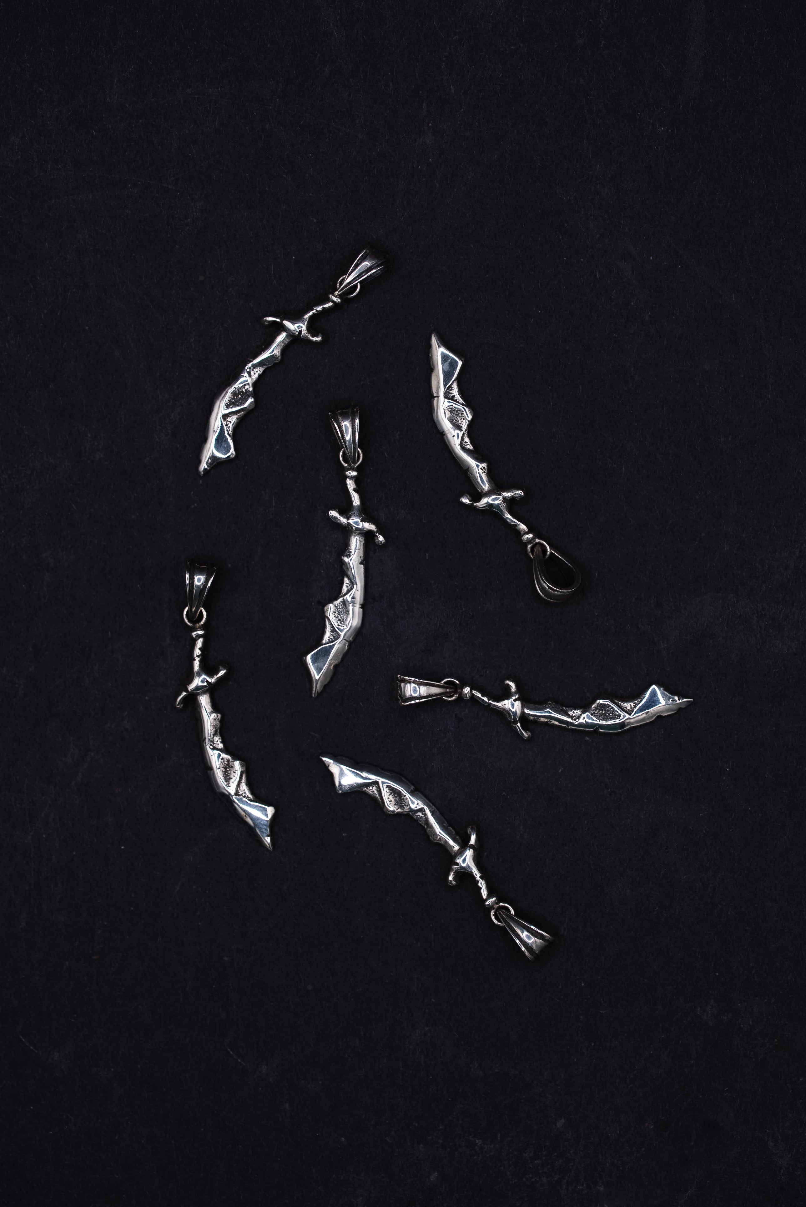 Inspired by the Dragon 'Scimmy' / Scimitar weapon from Old School Runescape. The design features marks and chips to give a 'worn' look to the weapon. The pendant has been hand-carved in wax before being cast in sterling-silver and oxidised to exaggerate the hand-engraved textures.