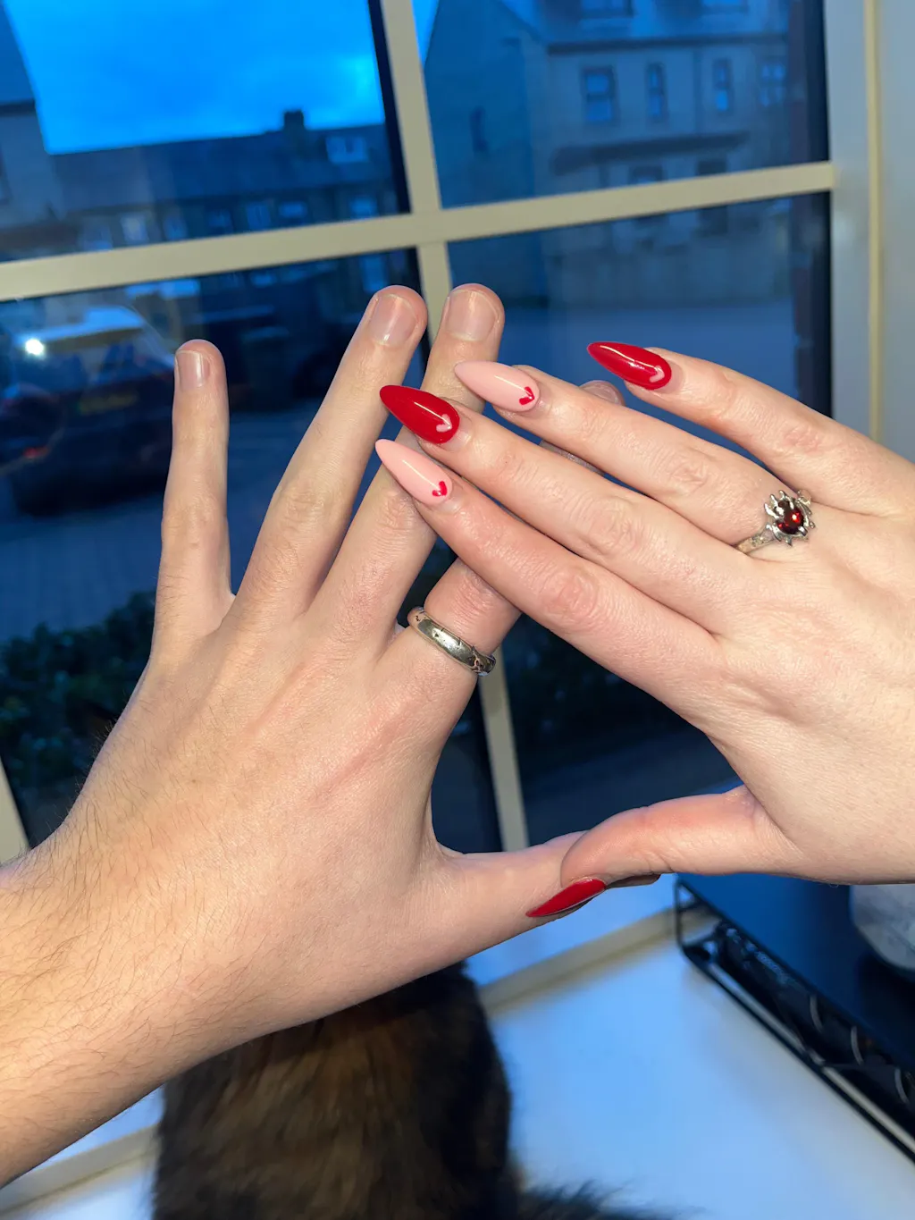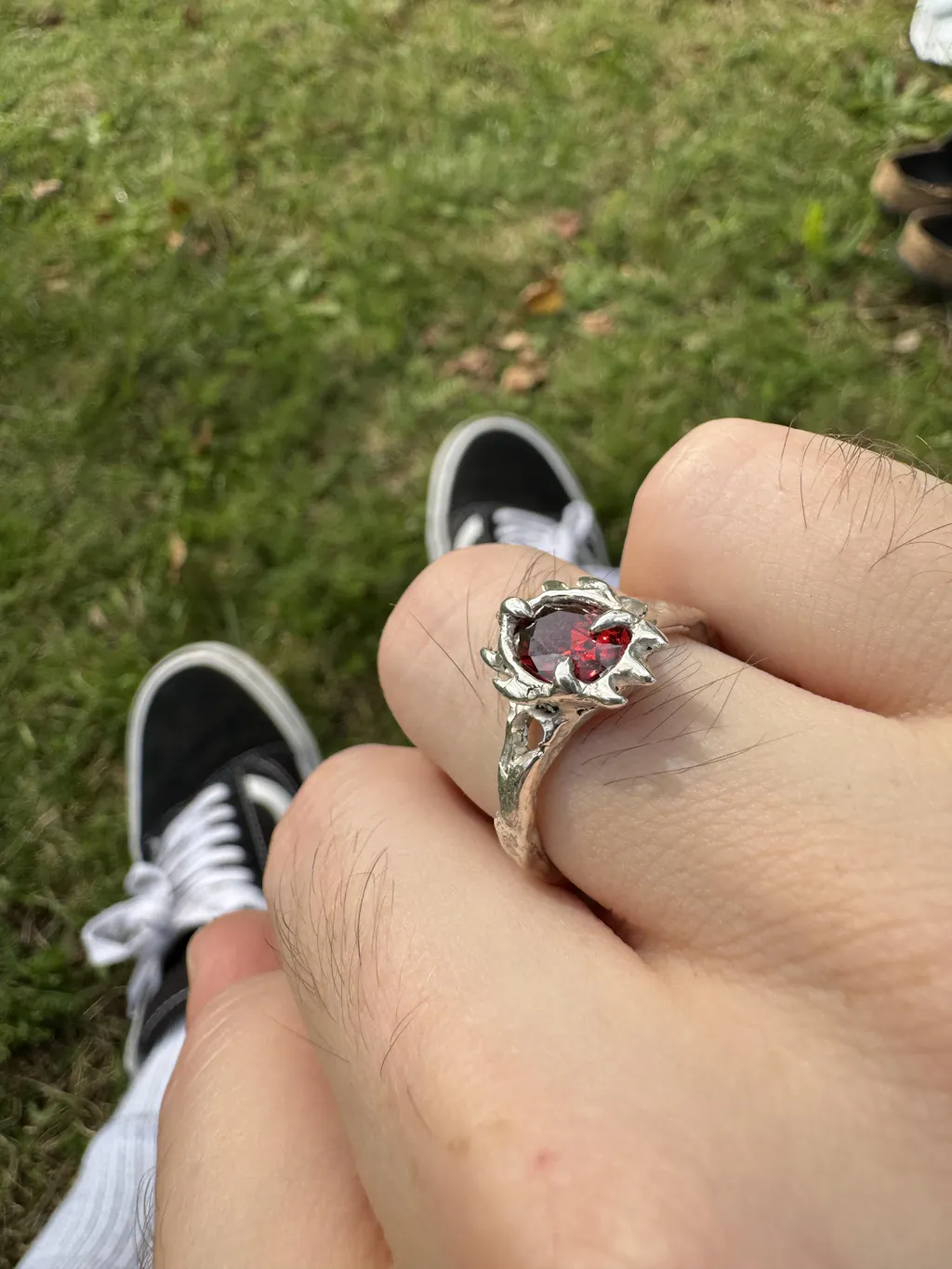 Inspired by the 'Gates of Oblivion' featured in the early 2000's video game, 'The Elder Scrolls: Oblivion'. The ring features a garnet coloured cz stone (8x6mm oval). The stone is held in place by 3 claws and 7 spikes surround the face of the ring. The back of the ring is open to help light flow through the stone.