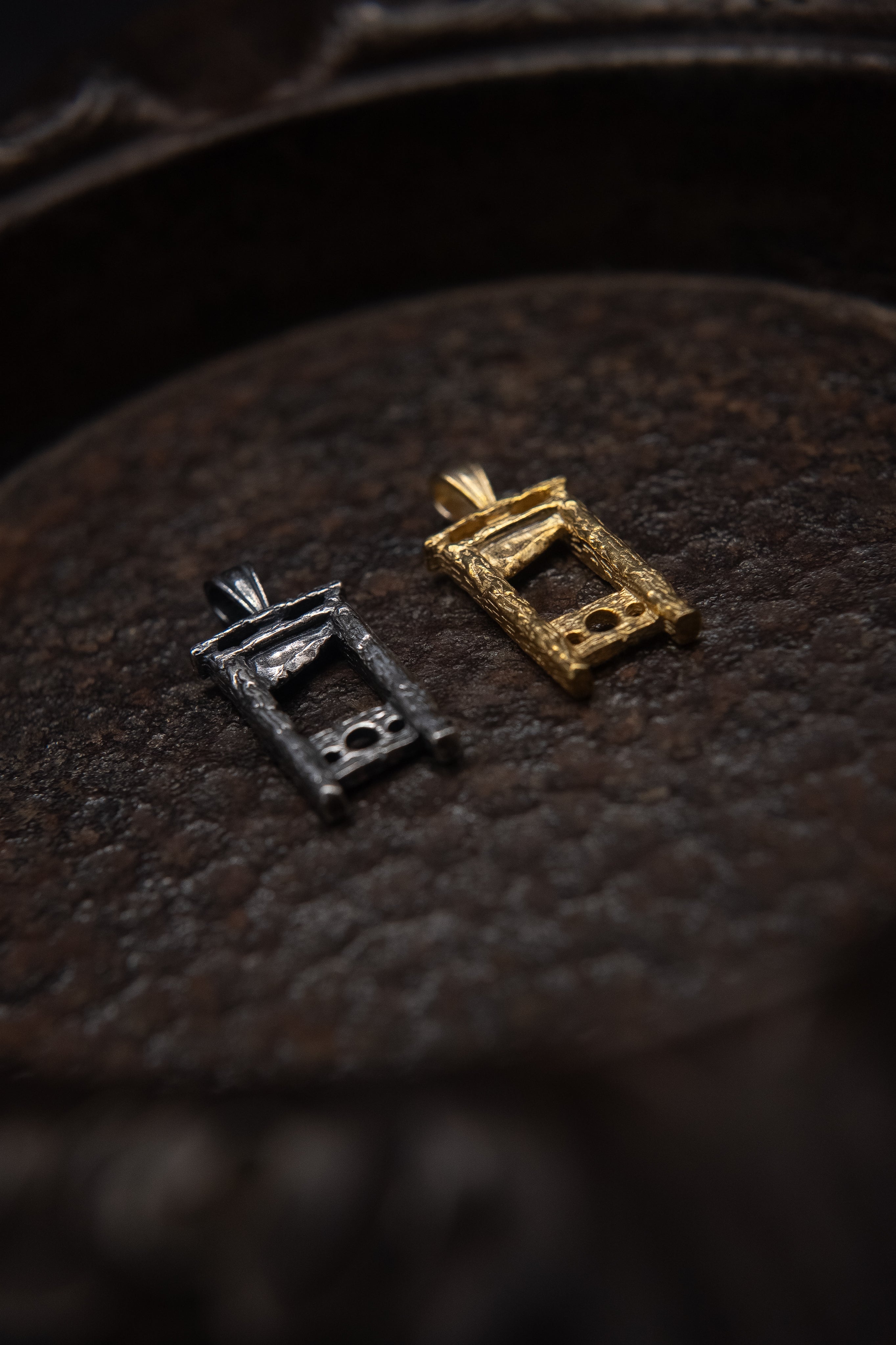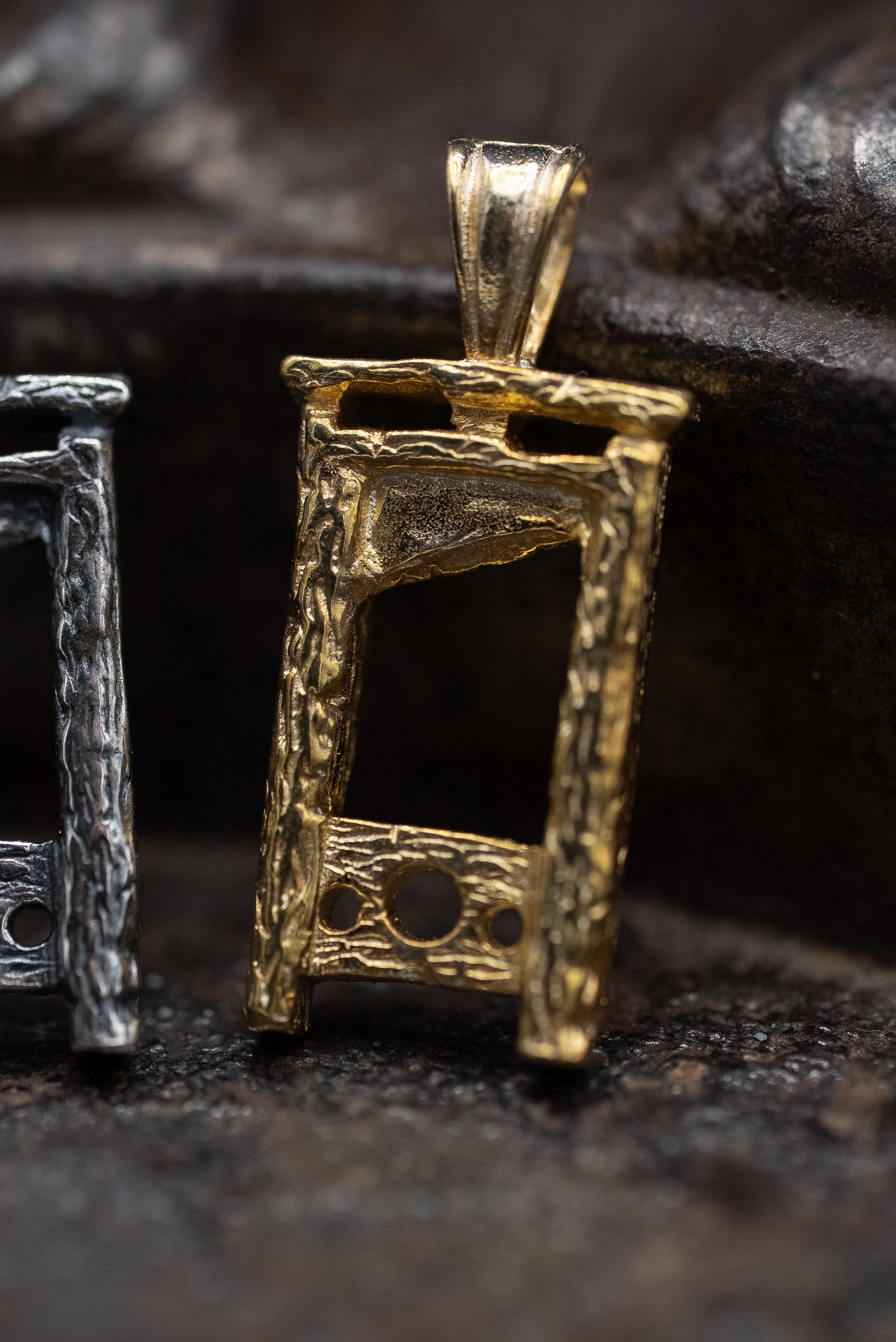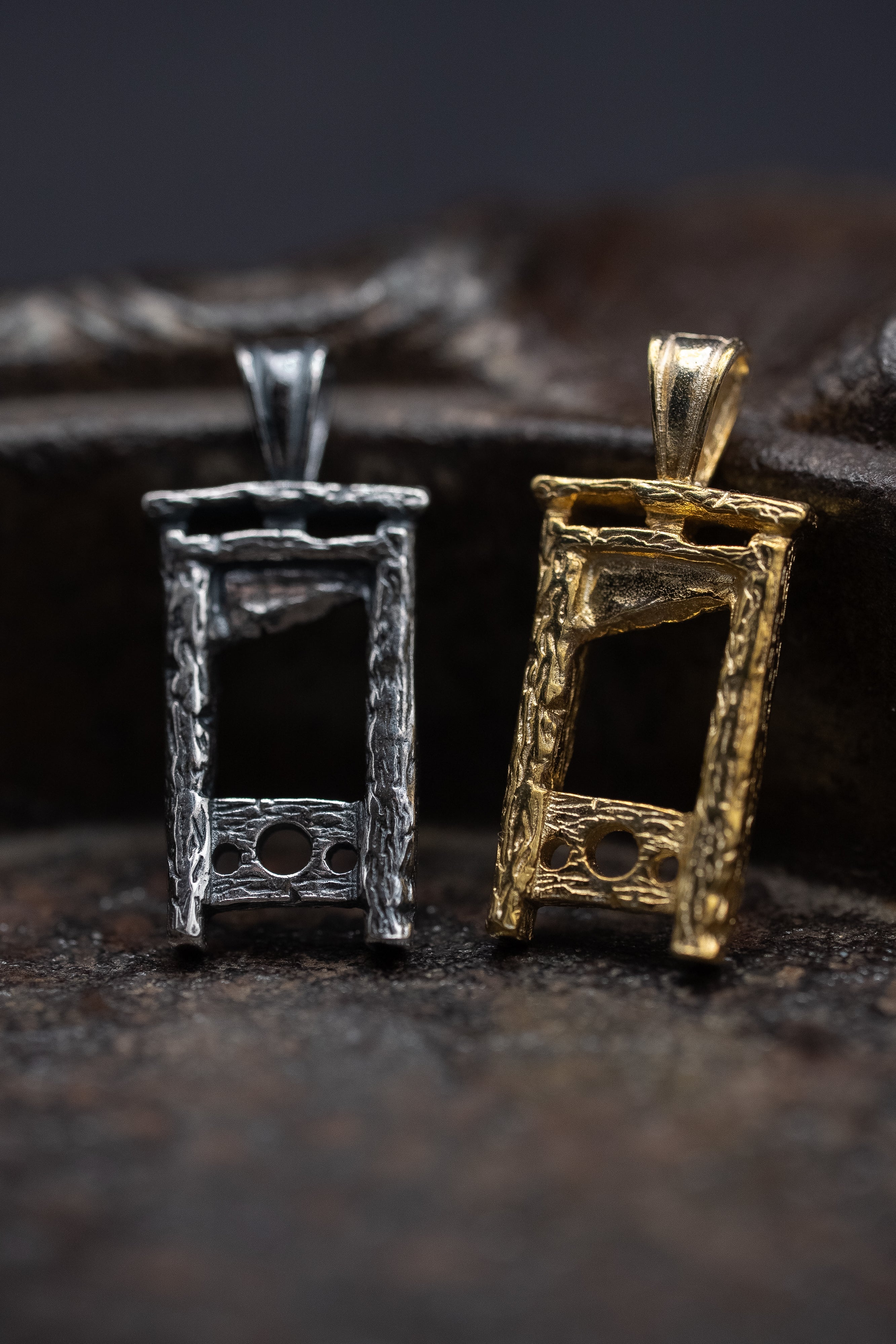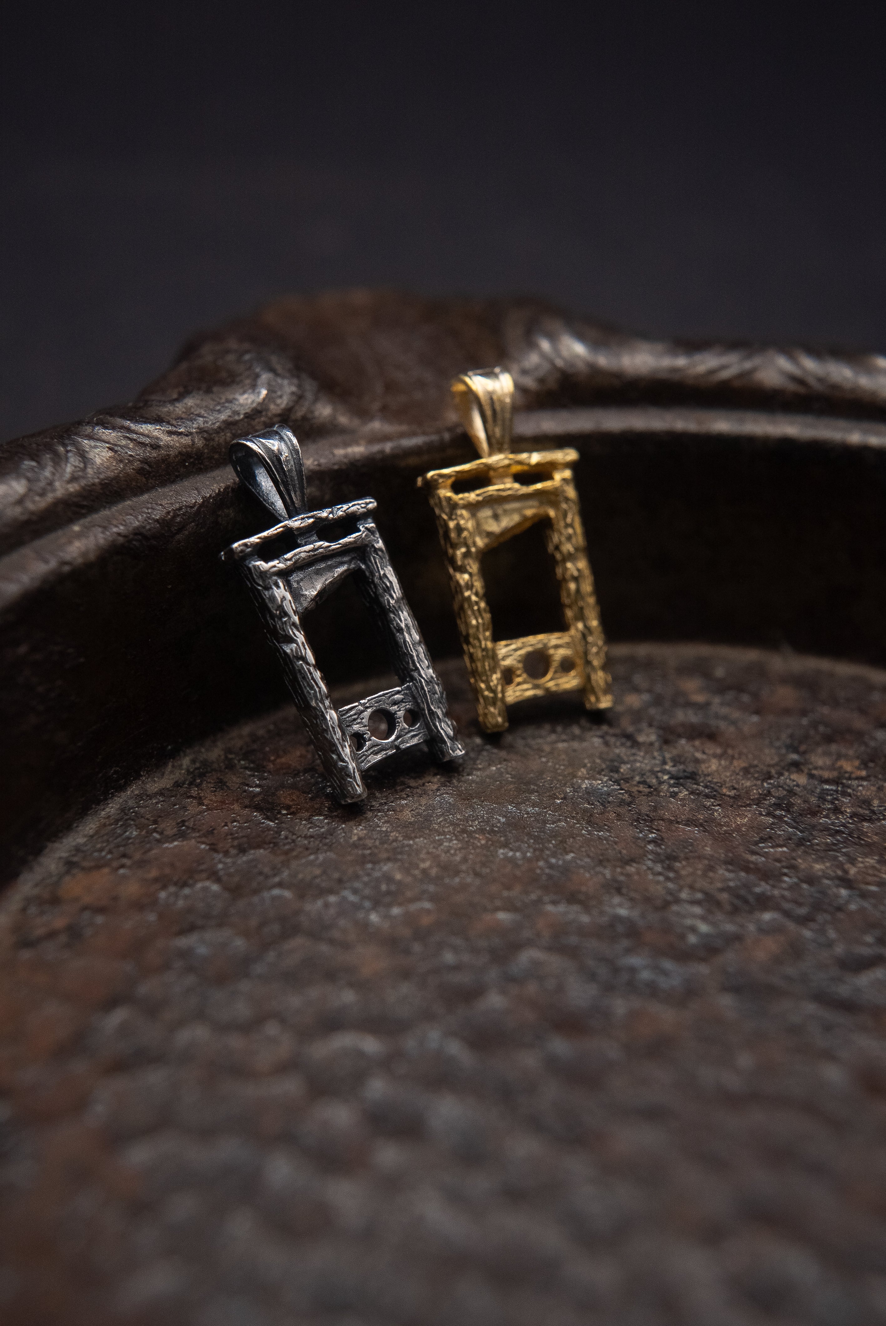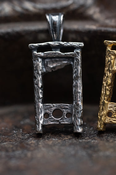 Inspired by the medieval guillotine, the design has been hand-carved in wax and cast in sterling silver. It has an oxidised polished finish. The pendant has a double-sided design and can be worn either way.